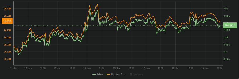 Litecoin is the 13th most popular cryptocurrency by market share. Like other coins, the price of Litecoin rose by 7,5% in the last week, parallel to the rise in the price of Bitcoin, i.e., from 80 USD to 86 USD, while its market share increased by 10%.